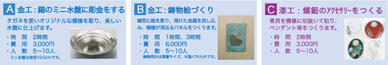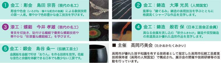 高岡の名工たち(高岡市伝統工芸産業技術保持者・高岡巧美会会員)が、ものづくりの技術をわかりやすく説明しながらていねいにサポートいたしますので、初心者でもステキなオリジナル作品ができあがります。