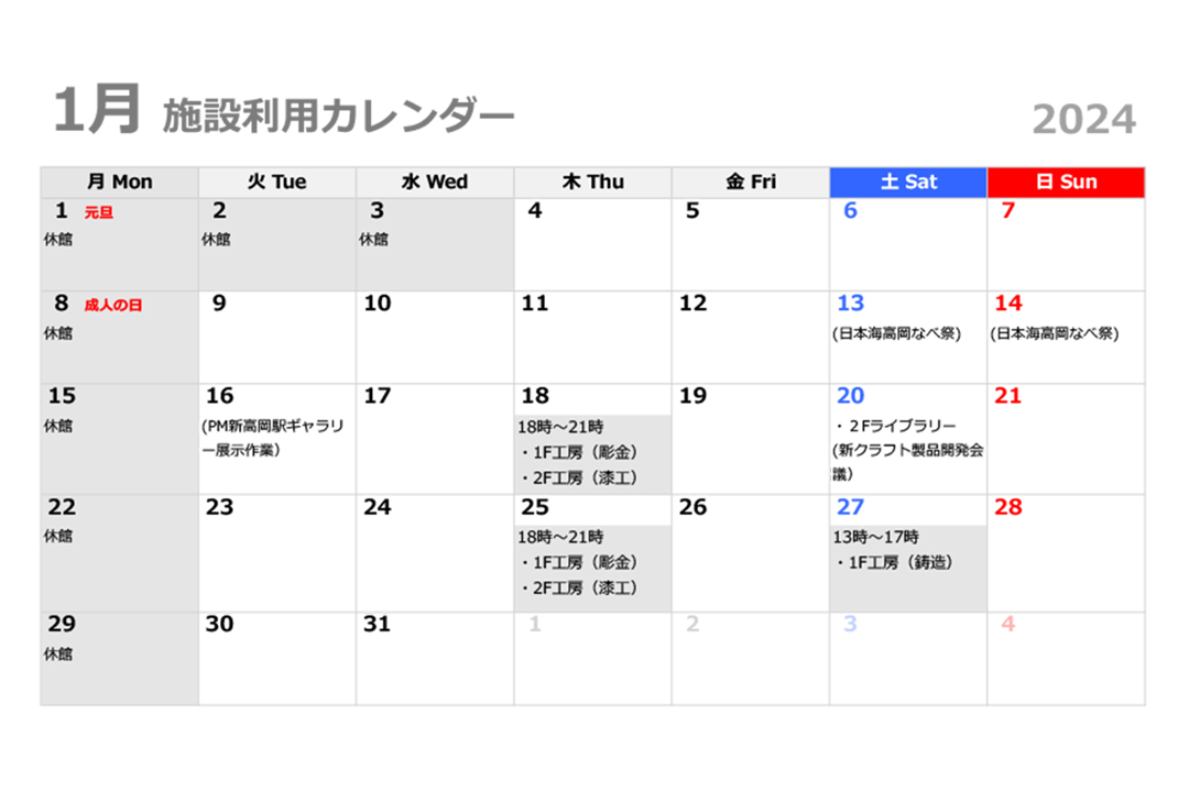 1月の施設利用カレンダー