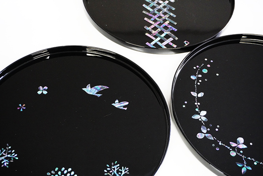 皆様の螺鈿体験作品(お盆)が完成しました。