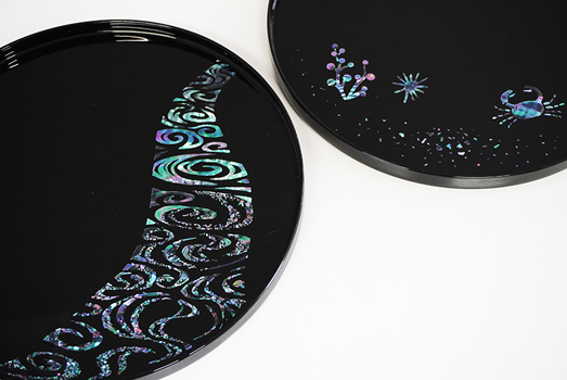 高岡の職人の手によって、貝の研ぎ出しと上塗りを施し、仕上げました。