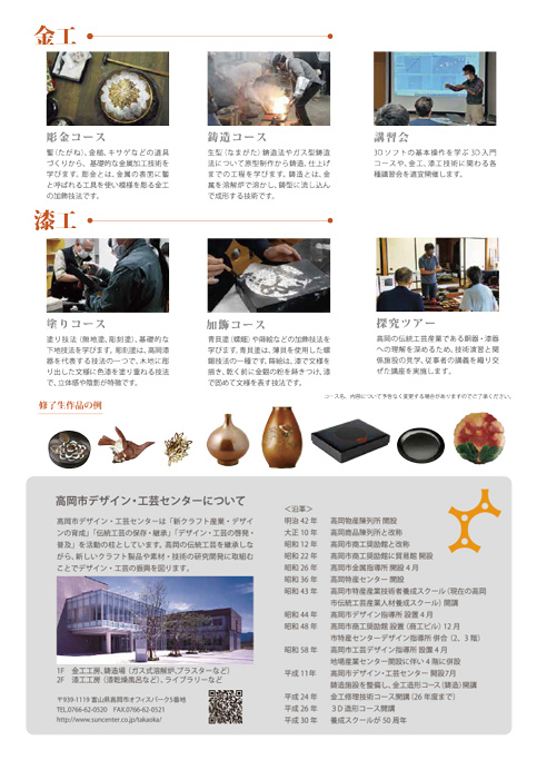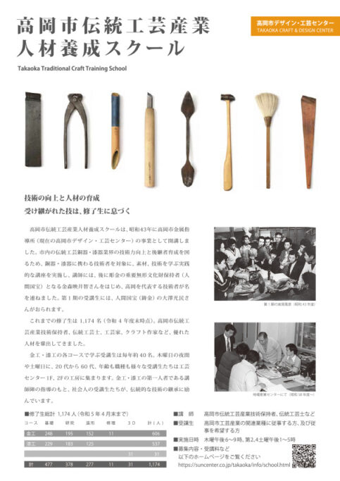 令和6年度 伝統工芸産業人材養成スクール受講生募集(4/30締切) 2024年4月11日 高岡の優れた金工・漆工の伝統的技術の幅広い実技演習を通して次代を担う人材を養成するスクールの受講生を募集しています。 ≫(PDF:945KB ) ・受講コース 金工(鋳造、高岡銅器探究、彫金・加工) 漆工(塗り) ・申込期限 令和6年4月30日(火) 詳細、申込については募集要項をご覧ください。 <関連記事> スクールのはなし(1)漆工コース紹介 スクールのはなし(2)鋳造コース紹介 スクールのはなし(3)彫金コース紹介 スクールのはなし(4)映像紹介