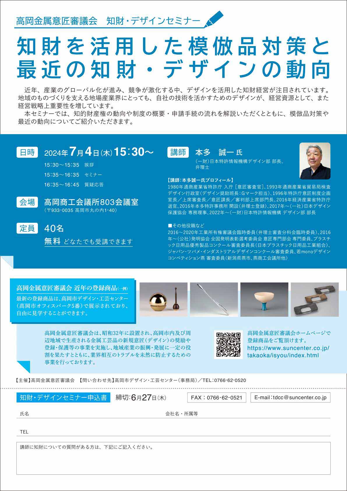 高岡金属意匠審議会(事務局:高岡市デザイン・工芸センター)では、知的財産権の啓発事業として知的財産権セミナーを開催しております。