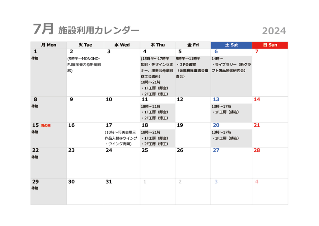 7月の施設利用カレンダー