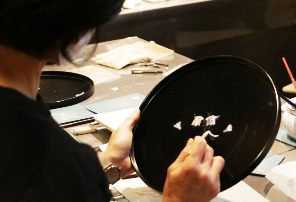 螺鈿体験の作品は、いったん高岡に持ち帰って、貝の研ぎ出しと上塗りを施し仕上げてまいります。