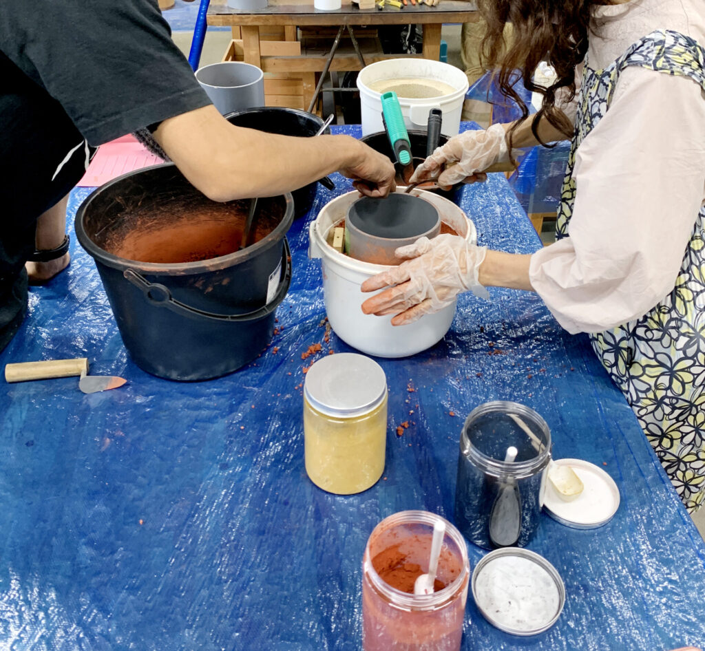 ▼▼土かまどづくり、土壁塗り体験の様子▼▼