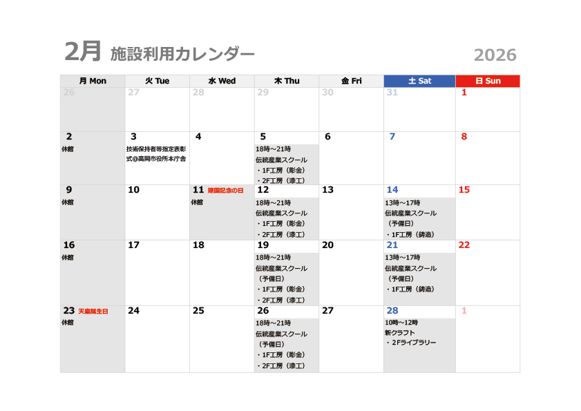 2月の施設カレンダー