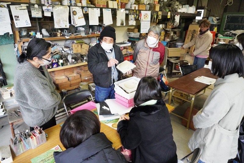 午前は、中村喜久雄氏(銅器)の工房にて、鋳物による錫の小皿を制作しました。