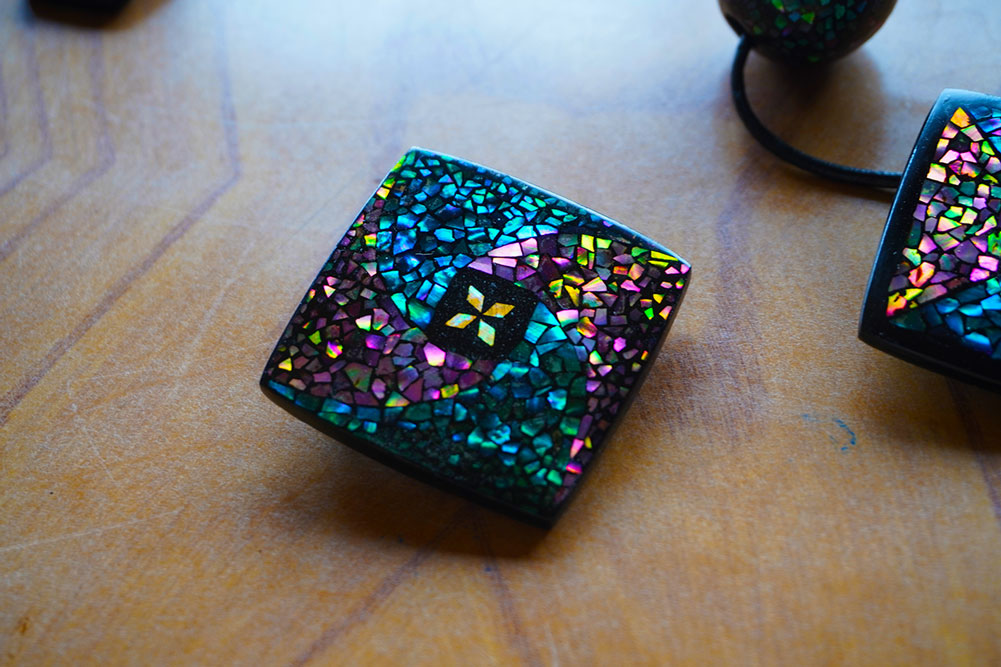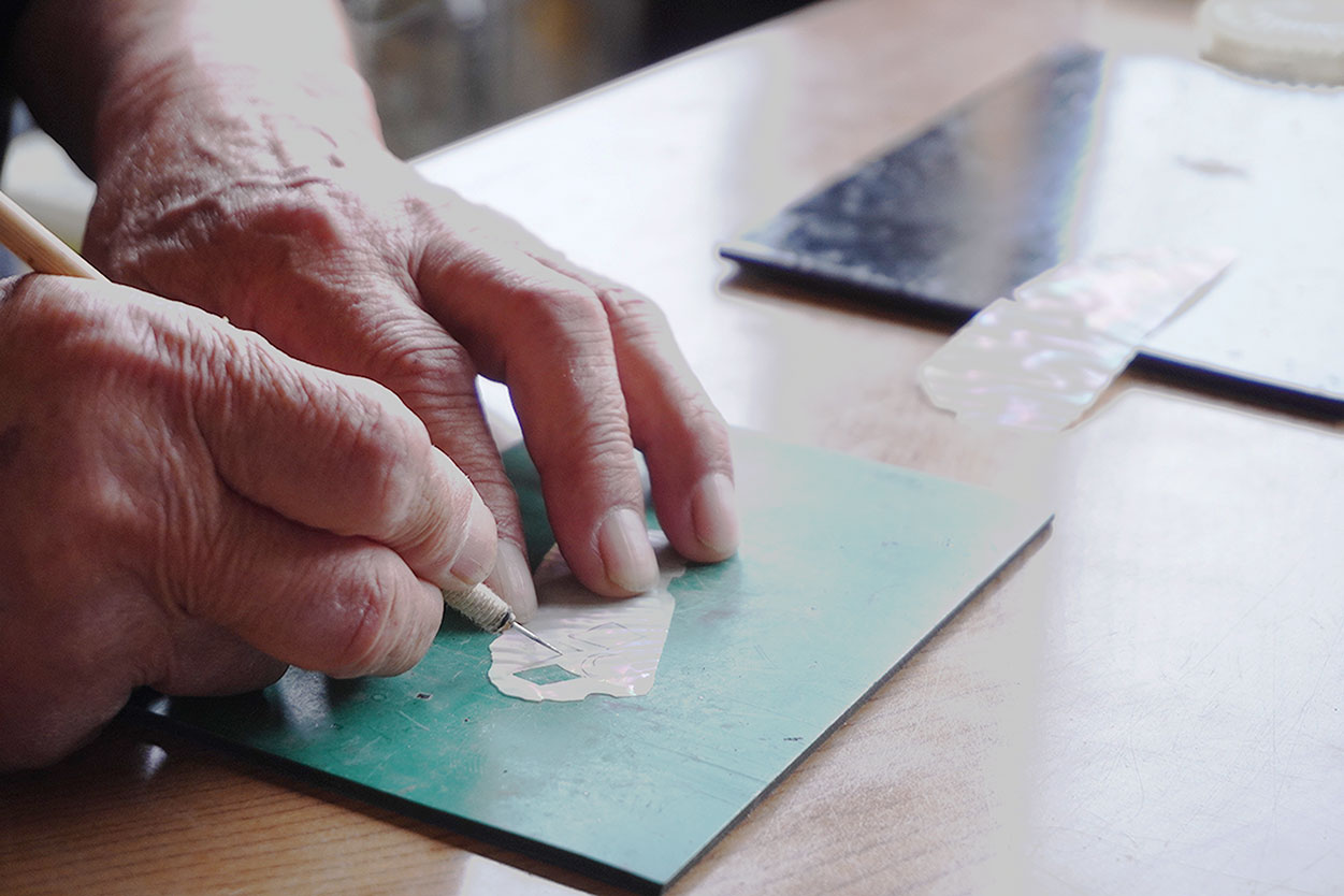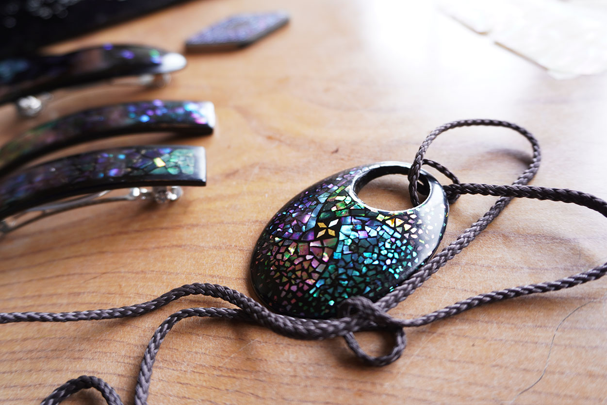 色とりどりの螺鈿は着色したものではなく貝本来の色です。同じ貝の中にも青みの強い部分と赤みの強い部分があって、まず色別に選り分けるところから始まります。