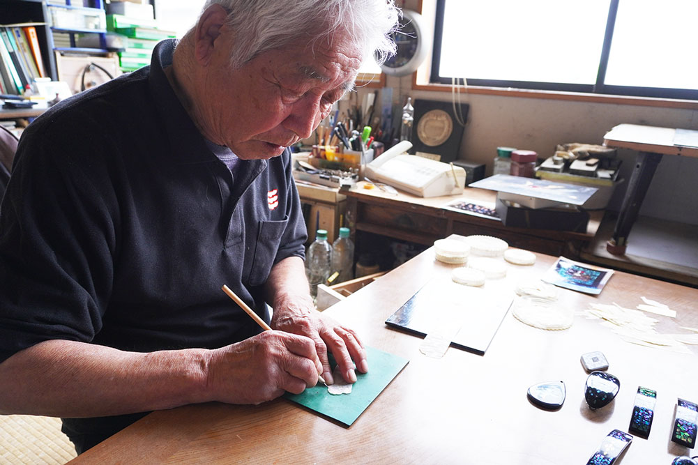 高岡巧美会相談役の今井孝雄さん(漆器・螺鈿)の工房におじゃましました。