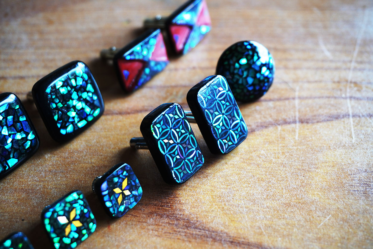 キラキラと乱反射する螺鈿の魅力を感じられる小物たち。カフスボタンは今井さんの愛用の品です。