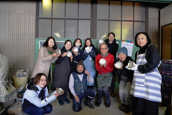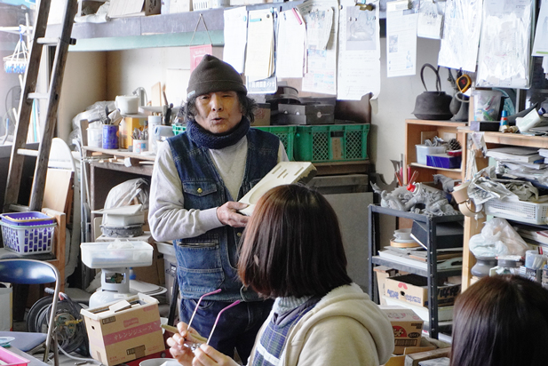 午前は、中村喜久雄氏(銅器)の工房にて、鋳物による錫の小皿を制作しました。