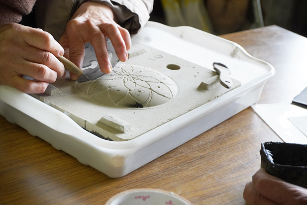 鋳物の型に、各々お好みの図柄を彫り込みます。